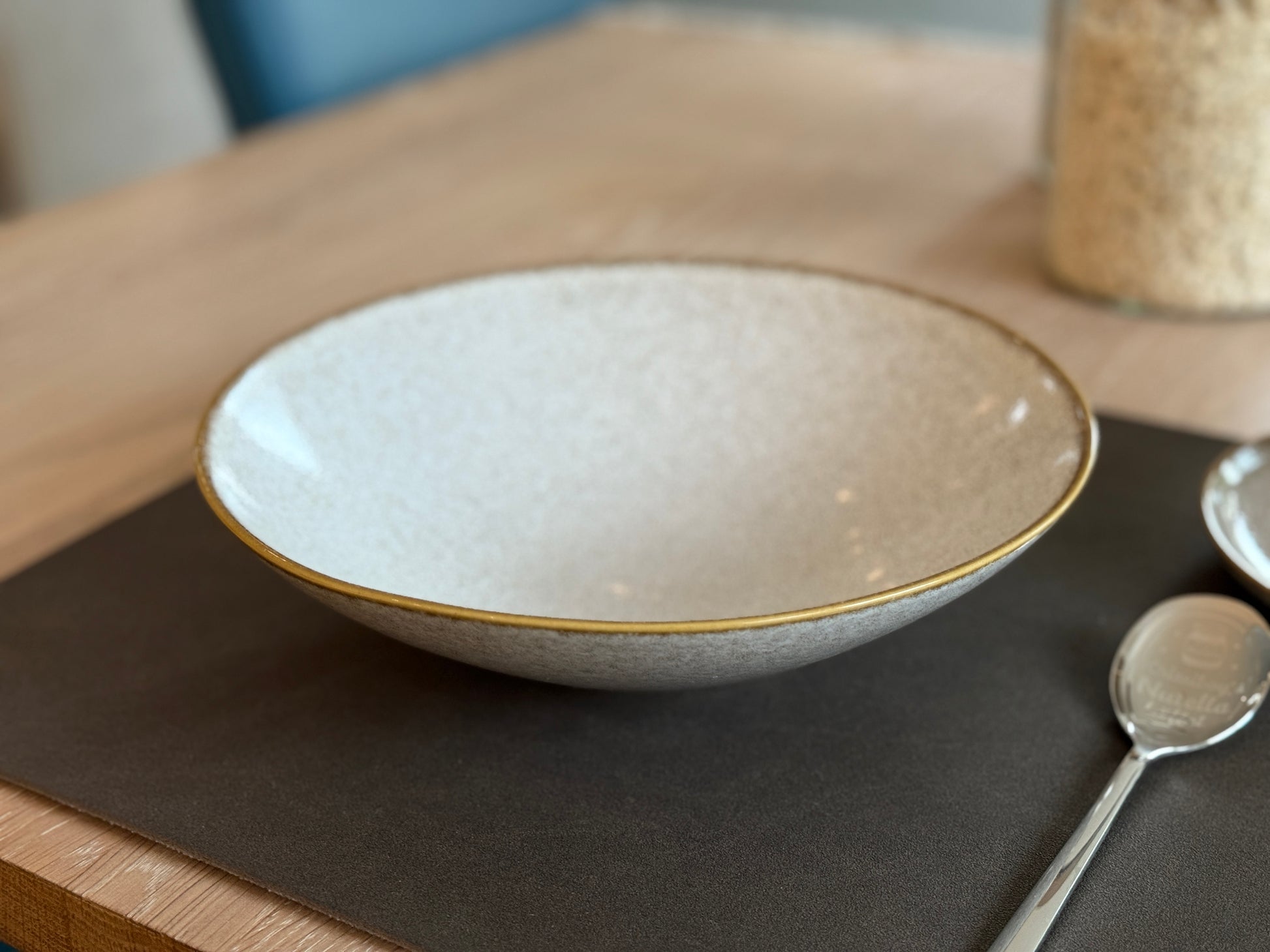 Diese große Bowl in wüstensand-weiß ist für alle Essensliebhaber geeignet! Mit einem Durchmesser von 23 cm und einer Höhe von 7 cm bietet Sie Platz für Hawaiianische Poké Bowl, italienische Pasta oder ein großartiges Frühstücks-Müsli.
