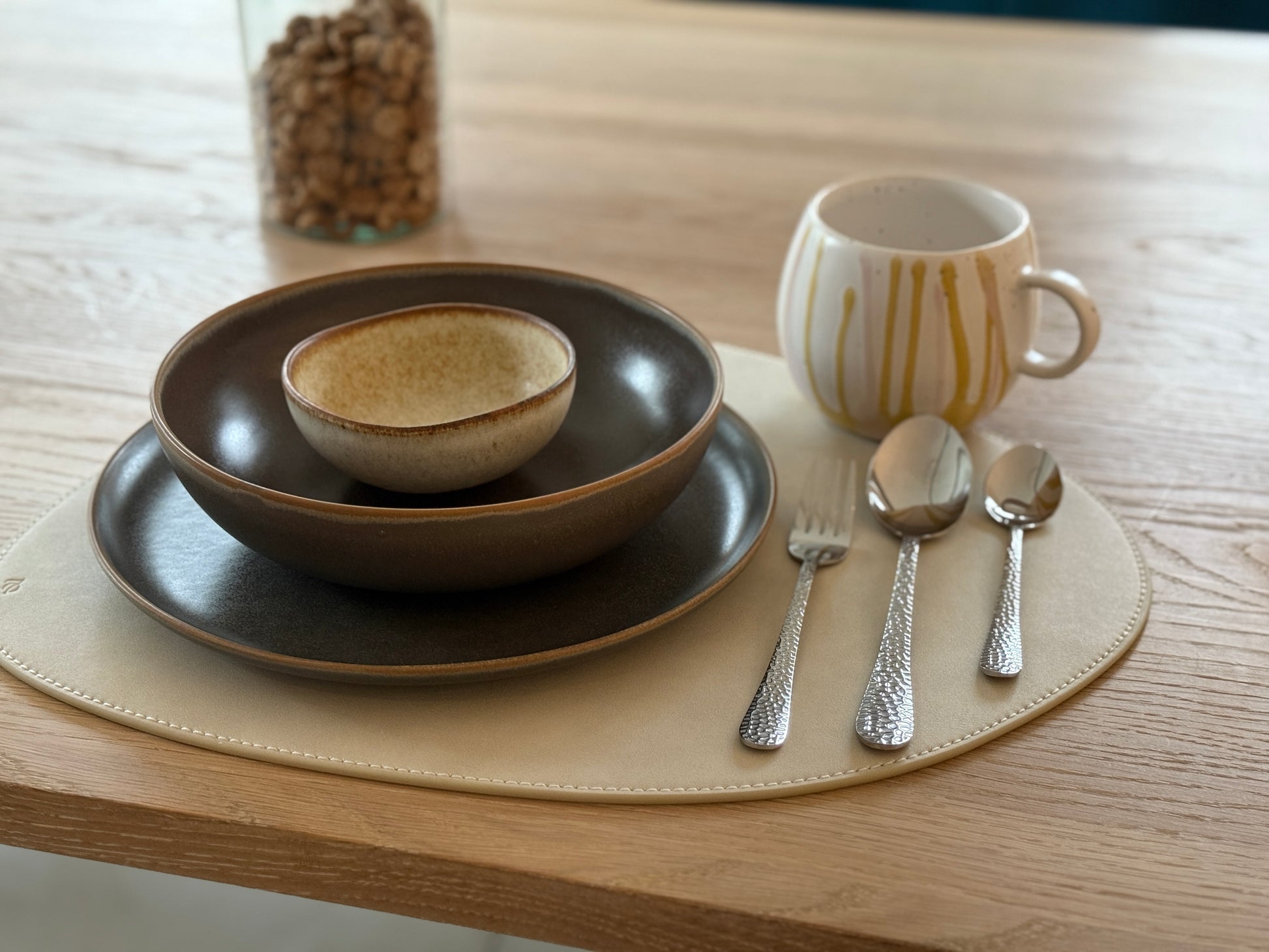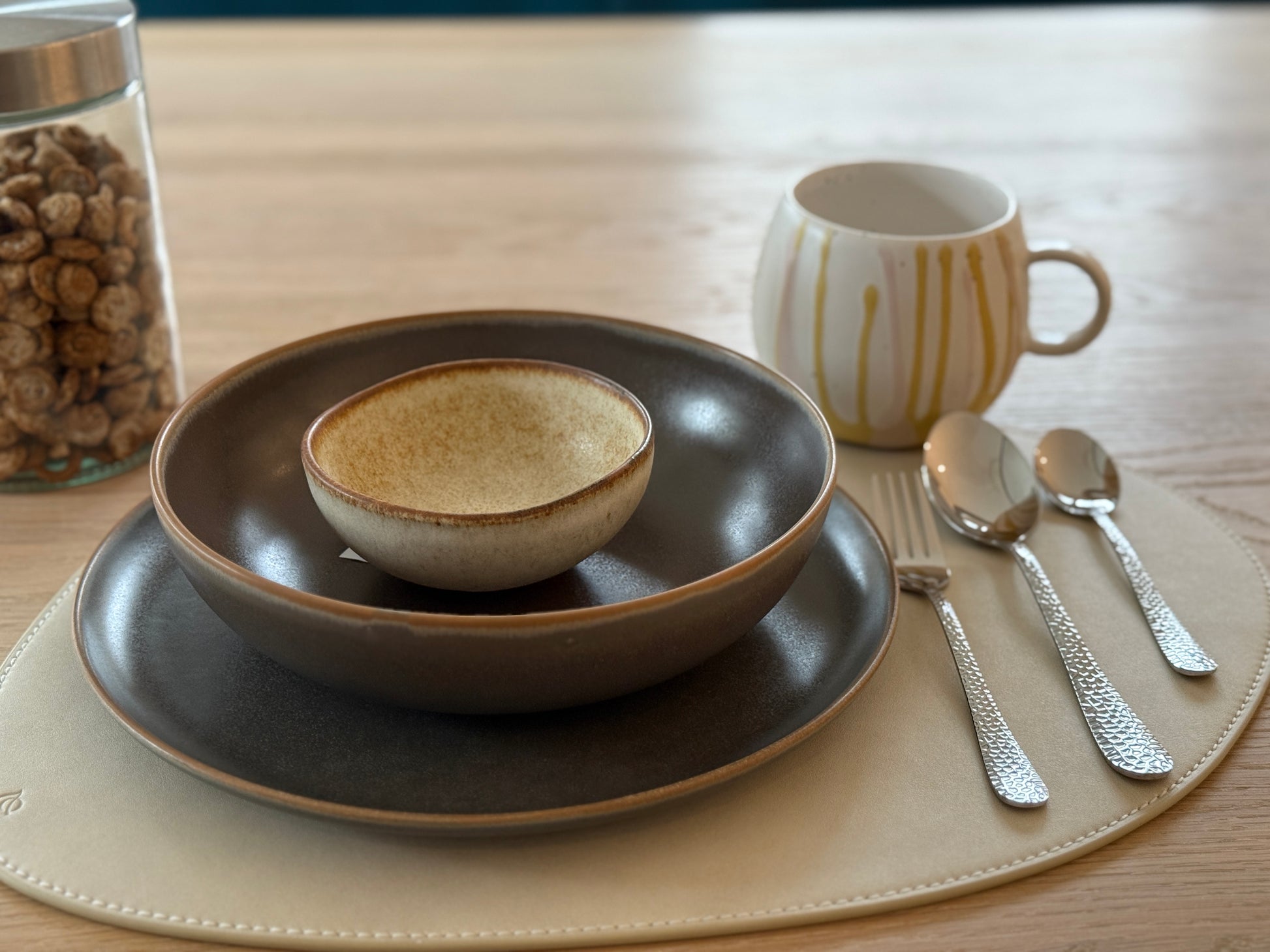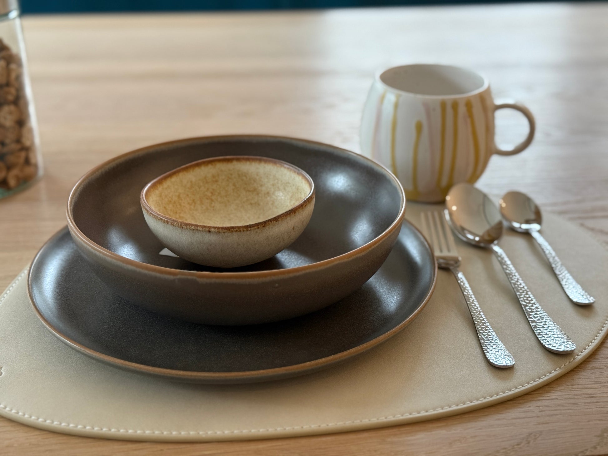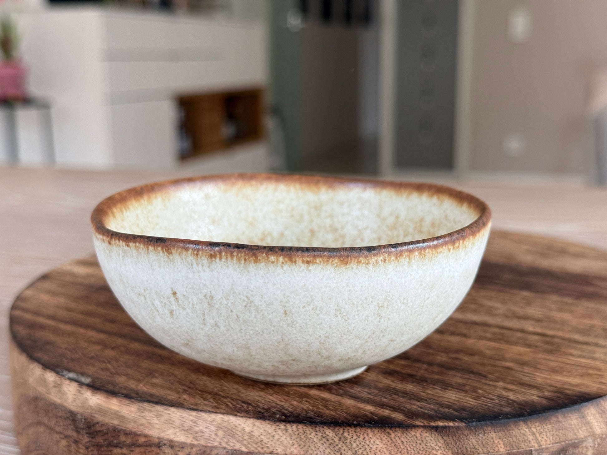 Diese schöne Bowl besticht mit Ihrem interessanten Farbverlauf in beige mit dunklem abgesetzten Rand, der absolute Eye-Catcher auf jedem Esstisch.